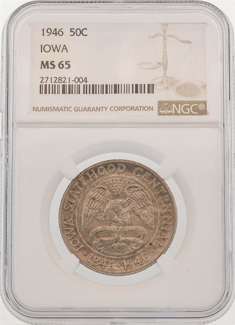 One 1946 Iowa Centennial Commemorative Half Dollar Coin NGC MS65. NGC Certified.