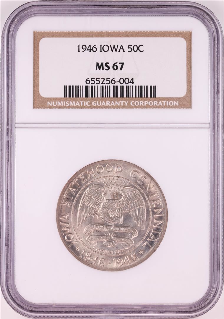 One 1946 Iowa Centennial Commemorative Half Dollar Coin NGC MS67. NGC Certified.