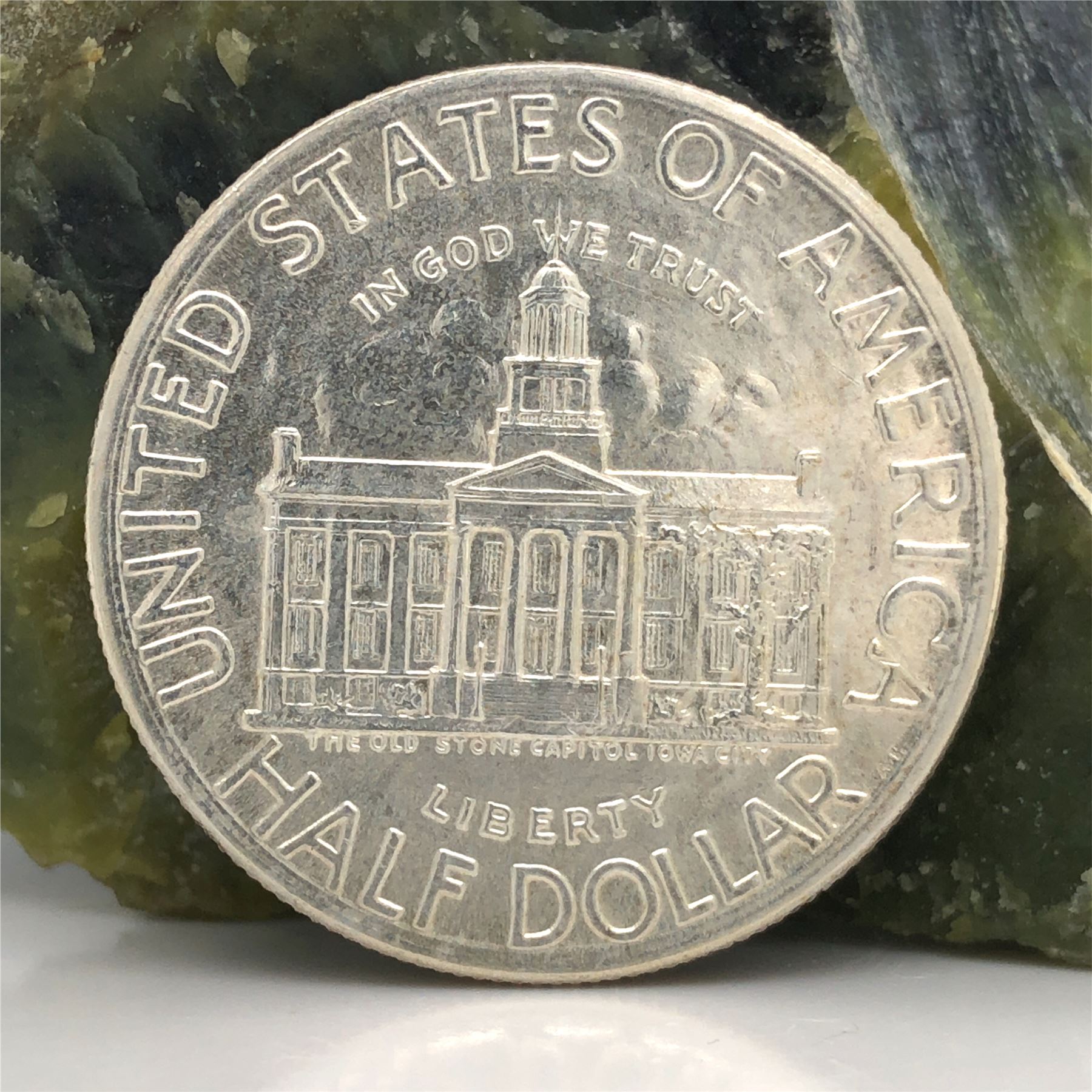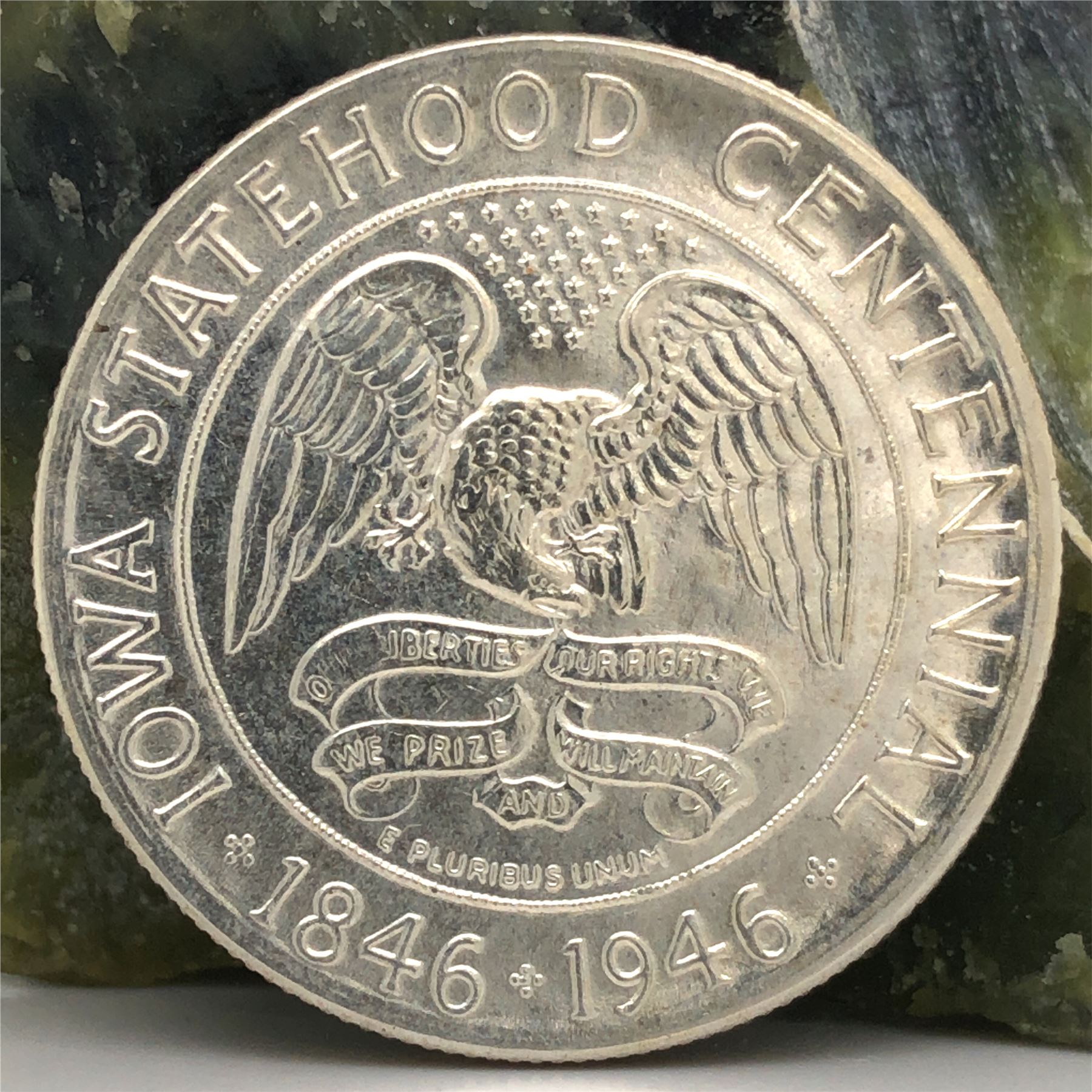 A 1946 Iowa Silver Commemorative Half Dollar in Choice BU condition. A snow white Classic Commemorative with great eye appeal. A great addition to any collection. Classic Condition with white surfaces, very original.& nbsp;