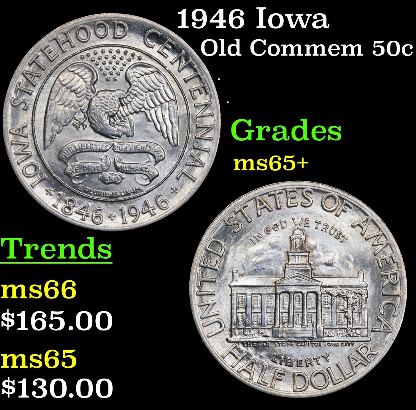 1946 Iowa Old Commem Half Dollar 50c Grades GEM+ Unc. The Iowa Commemorative marks the Final Run of the Old US Commemorative Program. The Iowa and the Booker T. Washington were approved on the same day by President Truman and mark an End to the Program. When looking at an Iowa Commemorative, check for signs of wear on the Eagle’s Neck and Head, and on the Building’s Central Pillars.