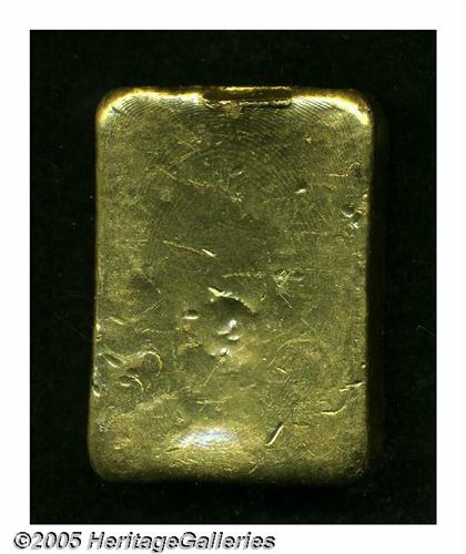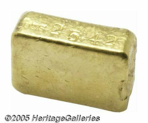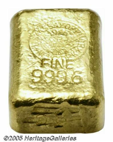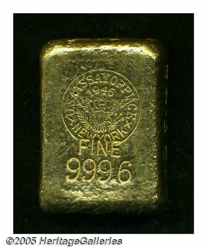 <B>1946 New York Assay Office Gold Ingot.</B></I> This hefty ingot has the imprint of the U.S. ASSAY OFFICE / NEW YORK on the obverse with the eagle in the center and the date, 1946, above. Partially overlapping the bottom of the imprint is FINE / 999.6. One of the long sides reads: OZS. 25.42. Each of the short sides shows several digs where gold has been removed.
