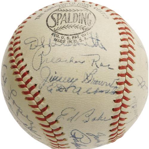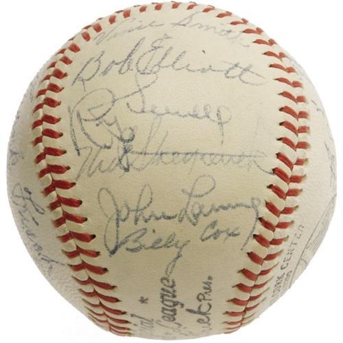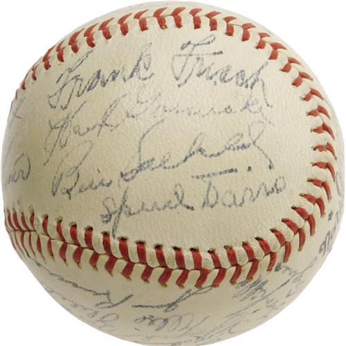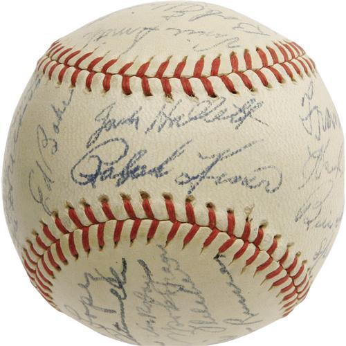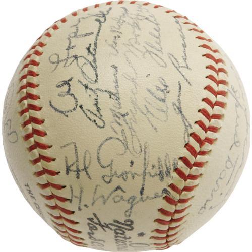 <B>1946 Pittsburgh Pirates Team Signed Baseball with Honus Wagner.</B></I> A dismal seventh place finish for the Bucs this season can do nothing to dampen the excitement any collector should feel when faced with a 9/10 signature from the man pictured on the hobby's most expensive card. "H. Wagner" signs in on this ONL (Frick) ball as a coach for the team he first represented in the final season of the nineteenth century. Among the twenty-four with him are fellow Hall of Famers Lopez, Frisch and Kiner, each of whom joins Wagner and the rest in the 8/10 to 9/10 quality range. The balance of the autographs is equally impressive. Surely one of the finest examples you'll find from this troubled yet talent-packed team. <I>LOA from PSA/DNA. From the Personal Collection of Preacher Roe, with his letter of provenance.</B></I> <BR><BR><B>Important notice:</B> Heritage usually auctions material at the rate of 200-250 lots per hour. On some occasions eBay Live bid software or the Internet may not be able to keep up with the pace of the auction. We recommend placing a realistic absentee bid now as insurance to avoid disappointment. Occasionally the auctioneer may eliminate or reject an eBay Live bid, and the auctioneer may also reopen a lot after the close of the eBay live bidding (usually because we missed an audience bid), and may reject your bid even if it shows you as the winning bidder. By bidding via eBay Live, you agree that Heritage may award the lot to another bidder at its sole discretion under the circumstances described above or any other reasonable circumstances. Since eBay bids are not shown to us until we open the lot on the floor, we treat those bids just like floor bids. In most cases the floor responds before the eBay bid is presented to us, due to Internet lag time, so for consistency we have made it a policy that floor bids are always considered first over tie eBay live bids. Also please note that all Heritage lots purchased through eBay Live carry a 22.5% Buyer's Premium. Please make sure you read the Terms and Conditions before you bid. This lot is being auctioned in conjunction with a live floor auction by Heritage Galleries & Auctioneers. All final auction and invoice information will be supplied by Heritage Galleries & Auctioneers, and all other information should be considered preliminary. Lot:19397 <BR><BR><B>Winning Notification and Billing:</B> After the FINAL session in this auction is complete, Heritage will send e-mail and snail mail invoices. This process normally takes several days. All final auction and invoice information will be supplied by Heritage Galleries & Auctioneers, and all other information should be considered preliminary. <BR><BR>This auction will be conducted on a live auction floor and over the Internet through eBay Live. If you choose to place an absentee bid, please take a moment to <font color='#0000ff'><u><a href='http://pages.ebay.com/liveauctions/help/before/laabsentee.html'>learn how eBay Live absentee bidding works</a></u></font><font color='#000000'>