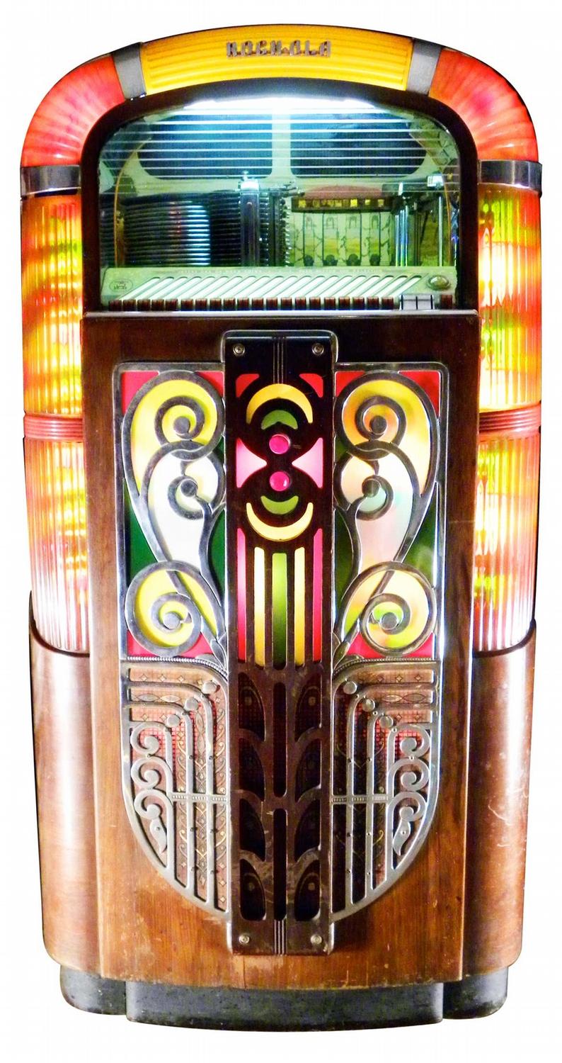 Rock-Ola Model 1422 Juke Box, 1946. Composite front with rainbow light up motif. Shortest changing cycle of any coin-operated phonograph ever marketed. Plays 20 selections, 5/10/25 cents. Complete with coin. Full of records. Excellent working condition with older restoration. 29 X 57 X 26 inches.