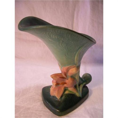Up for sale is a Roseville Zephyr Lily cornucopia that was produced in 1946. It is just slightly over 6" tall. It is in very good condition with no cracks or chips. There is a slight amount of overall crazing that has not darkened. If you have any other questions please email us. Thanks for looking.