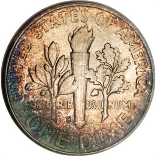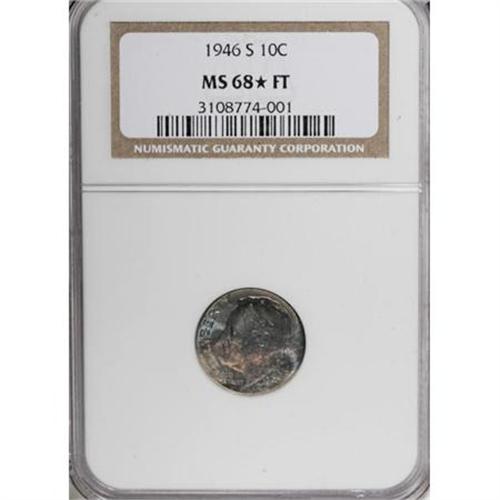 <B>1946-S 10C MS68 <img src="/images/star.gif" width="10" height="10" alt="" border="0"> Full Torch NGC.</B></I> Solidly struck for this first-year issue with exemplary preservation and vibrant patina. The obverse shows bands of sea-green, azure, ruby, and orange, while the satiny reverse shows crescents of similar toning at the lower left of that otherwise untoned side. A magnificent survivor and one of the strongest imaginable candidates for the NGC Registry collector.<BR><BR><B>Coin Engraver:</B> John R. Sinnock<BR><BR><b>Shipping:</b> Coins & Currency (<a target="_blank" href="http://www.heritageauctions.com/common/shipping.php">view shipping information</a>)