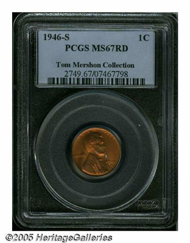 <B>1946-S<1C> MS67 Red PCGS.</B></I> A nicely struck and exquisitely preserved Superb Gem that has flashy luster and bright original red color. Conditionally scarce with none graded any higher, by PCGS. Population: 53 in 67 Red, 0 finer (3/05).<BR><I>From The Tom Mershon #2 All-Time PCGS Registry Set of Lincoln Wheat Cents.</B></I>