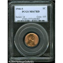 1946-S 1C MS67 Red PCGS. A nicely struck and exqui <B>1946-S 1C MS67 Red PCGS.</B></I> A nicely struck and exquisitely preserved Superb Gem that has flashy luster and bright original purple-red and pink-red coloration. Population: 53 in 67, 0 finer (10/04). <BR><BR><B>Important notice:</B> Heritage usually auctions material at the rate of 200-250 lots per hour. On some occasions eBay Live bid software or the Internet may not be able to keep up with the pace of the auction. We recommend placing a realistic absentee bid now as insurance to avoid disappointment. Occasionally the auctioneer may eliminate or reject an eBay Live bid, and the auctioneer may also reopen a lot after the close of the eBay live bidding (usually because we missed an audience bid), and may reject your bid even if it shows you as the winning bidder. By bidding via eBay Live, you agree that Heritage may award the lot to another bidder at its sole discretion under the circumstances described above or any other reasonable circumstances. Since eBay bids are not shown to us until we open the lot on the floor, we treat those bids just like floor bids. In most cases the floor responds before the eBay bid is presented to us, due to Internet lag time, so for consistency we have made it a policy that floor bids are always considered first over tie eBay live bids. Also please note that all Heritage lots purchased through eBay Live carry a 20% Buyer's Premium. Please make sure you read the Terms and Conditions before you bid. This lot is being auctioned in conjunction with a live floor auction by Heritage Galleries & Auctioneers. All final auction and invoice information will be supplied by Heritage Galleries & Auctioneers, and all other information should be considered preliminary. Lot:5365