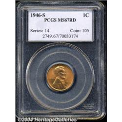 <B>1946-S<1C> MS67 Red PCGS.</B></I> Well struck and fully lustrous, with beautiful red color and just one apparent surface blemish, on the reverse, directly above the T in CENT. Population: 51 in 67, 0 finer (3/04).<BR><I>From The Kyle Patrick collection of Lincoln Cents.</B></I> <BR><BR><B>Important notice:</B> Heritage usually auctions material at the rate of 200-250 lots per hour. On some occasions eBay Live bid software or the Internet may not be able to keep up with the pace of the auction. We recommend placing a realistic absentee bid now as insurance to avoid disappointment. Occasionally the auctioneer may eliminate or reject an eBay Live bid, and the auctioneer may also reopen a lot after the close of the eBay live bidding (usually because we missed an audience bid), and may reject your bid even if it shows you as the winning bidder. By bidding via eBay Live, you agree that Heritage may award the lot to another bidder at its sole discretion under the circumstances described above or any other reasonable circumstances. Since eBay bids are not shown to us until we open the lot on the floor, we treat those bids just like floor bids. In most cases the floor responds before the eBay bid is presented to us, due to Internet lag time, so for consistency we have made it a policy that floor bids are always considered first over tie eBay live bids. Also please note that all Heritage lots purchased through eBay Live carry a 20% Buyer's Premium. Please make sure you read the Terms and Conditions before you bid.