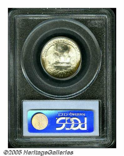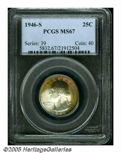 <B>1946-S<25C> MS67 PCGS.</B></I> Frosty luster endows each side of this '46-S quarter. Gold, sea-green, and crimson patina occupies portions of the borders, leaving the remaining surfaces brilliant. A tiny mark at the truncation of Washington's neck is not bothersome. Population: 43 in 67, 3 finer (3/05).