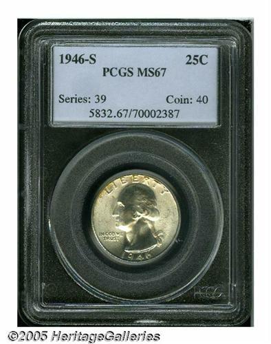 <B>1946-S<25C> MS67 PCGS.</B></I> Well struck with a very bright satiny sheen, and a small degree of dappled apricot patina on the upper obverse. The expertly preserved surfaces are distraction-free and nearly pristine. Population: 43 in 67, 3 finer (4/05).