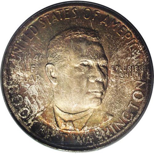 <B>1946-S<50C> Booker T. Washington MS66 PCGS.</B></I> Deep copper, rose, and fuchsia toning covers both sides of this beautiful coin. A couple of tiny abrasions on Booker T. Washington's cheek prevent a higher grade, but this coin represents a combination of excellent value and high eye appeal. <BR><BR><B>Important notice:</B> Heritage usually auctions material at the rate of 200-250 lots per hour. On some occasions eBay Live bid software or the Internet may not be able to keep up with the pace of the auction. We recommend placing a realistic absentee bid now as insurance to avoid disappointment. Occasionally the auctioneer may eliminate or reject an eBay Live bid, and the auctioneer may also reopen a lot after the close of the eBay live bidding (usually because we missed an audience bid), and may reject your bid even if it shows you as the winning bidder. By bidding via eBay Live, you agree that Heritage may award the lot to another bidder at its sole discretion under the circumstances described above or any other reasonable circumstances. Since eBay bids are not shown to us until we open the lot on the floor, we treat those bids just like floor bids. In most cases the floor responds before the eBay bid is presented to us, due to Internet lag time, so for consistency we have made it a policy that floor bids are always considered first over tie eBay live bids. Also please note that all Heritage lots purchased through eBay Live carry a 20% Buyer's Premium. Please make sure you read the Terms and Conditions before you bid. This lot is being auctioned in conjunction with a live floor auction by Heritage Galleries & Auctioneers. All final auction and invoice information will be supplied by Heritage Galleries & Auctioneers, and all other information should be considered preliminary. Lot:5115 <BR><BR><B>Winning Notification and Billing:</B> After the FINAL session in this auction is complete, Heritage will send e-mail and snail mail invoices. This process normally takes several days. All final auction and invoice information will be supplied by Heritage Galleries & Auctioneers, and all other information should be considered preliminary. <BR><BR>This auction will be conducted on a live auction floor and over the Internet through eBay Live. If you choose to place an absentee bid, please take a moment to <font color='#0000ff'><u><a href='http://pages.ebay.com/liveauctions/help/before/laabsentee.html'>learn how eBay Live absentee bidding works</a></u></font><font color='#000000'>