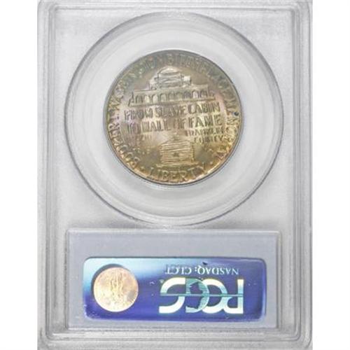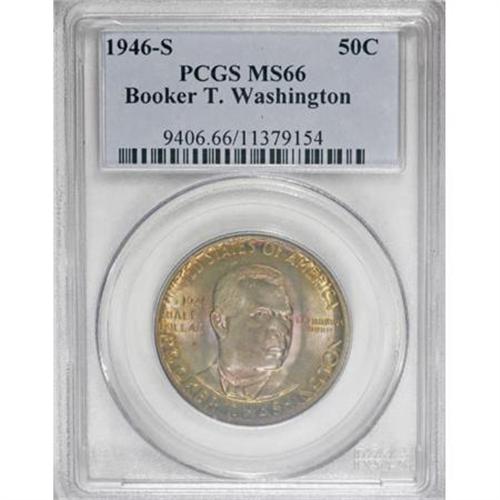 <B>1946-S 50C Booker T. Washington MS66 PCGS.</B></I> A blend of deep gold and lavender toning bathes both sides of this Premium Gem, each of which exhibits well struck design elements. A few light marks occur on the cheek and in the lower right obverse field, and a spot is visible at the E of MEMORIAL<BR><BR><b>Shipping:</b> Coins & Currency (<a target="_blank" href="http://www.heritageauctions.com/common/shipping.php">view shipping information</a>)