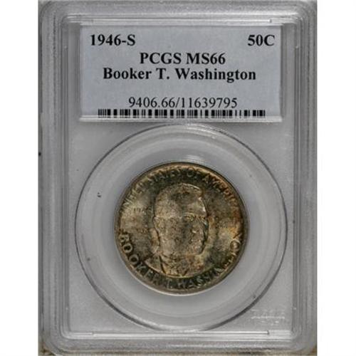 <B>1946-S 50C Booker T. Washington MS66 PCGS.</B></I> PCGS Population (303/43). NGC Census: (350/80). Mintage: 500,279. Numismedia Wsl. Price for NGC/PCGS coin in MS66: $140. (#9406)<BR><BR><b>Shipping:</b> Coins & Currency (<a target="_blank" href="http://www.heritageauctions.com/common/shipping.php">view shipping information</a>)