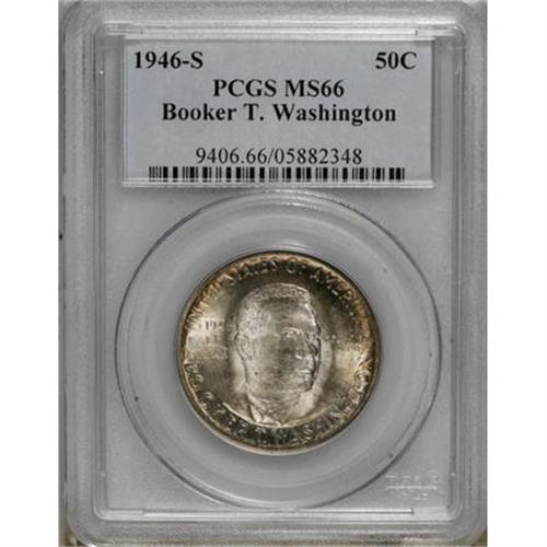 <B>1946-S 50C Booker T. Washington MS66 PCGS.</B></I> PCGS Population (303/43). NGC Census: (348/81). Mintage: 500,279. Numismedia Wsl. Price for NGC/PCGS coin in MS66: $140. (#9406)<BR><BR><b>Shipping:</b> Coins & Currency (<a target="_blank" href="http://www.heritageauctions.com/common/shipping.php">view shipping information</a>)