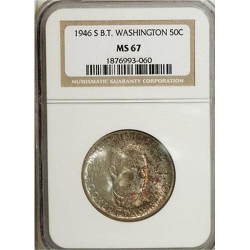 <B>1946-S 50C Booker T. Washington MS67 NGC.</B></I> Cherry-red, forest-green, and powder-blue toning enriches this lustrous and nicely impressed Superb Gem. Essentially void of post-strike contact. Census: 67 in 67, 4 finer (5/07).<BR><BR><b>Shipping:</b> Coins & Currency (<a target="_blank" href="http://www.heritageauctions.com/common/shipping.php">view shipping information</a>)