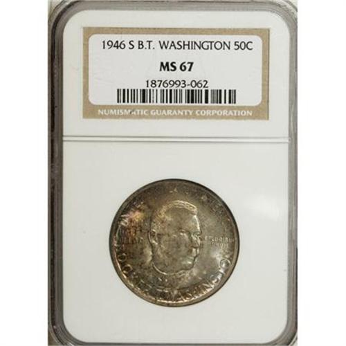 <B>1946-S 50C Booker T. Washington MS67 NGC.</B></I> Attractive fire-red, gold, and aquamarine envelop the unabraded fields. This lustrous Superb Gem has a good strike, although the texture of the planchet is sometimes visible on the portrait.<BR><BR><b>Shipping:</b> Coins & Currency (<a target="_blank" href="http://www.heritageauctions.com/common/shipping.php">view shipping information</a>)