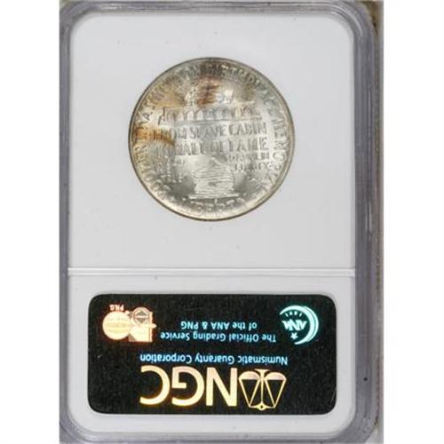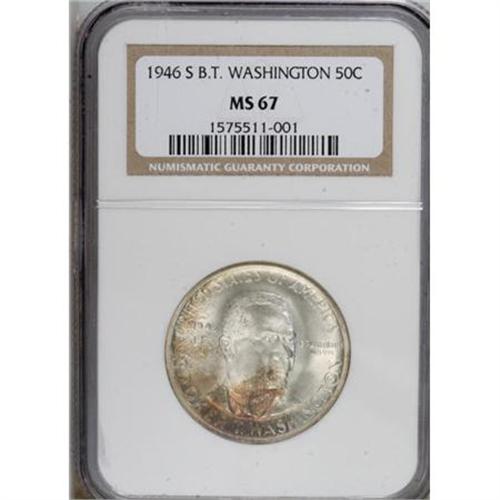 <B>1946-S 50C Booker T. Washington MS67 NGC.</B></I> This first-year S-mint issue had a mintage of over half a million pieces, but between melting and circulation, Superb Gem examples are elusive today. This frosty piece is well-defined and untoned save for areas of reddish-orange at the lower left obverse and the upper left reverse. NGC has graded only four coins finer (10/07).<BR><BR><b>Shipping:</b> Coins & Currency (<a target="_blank" href="http://www.heritageauctions.com/common/shipping.php">view shipping information</a>)
