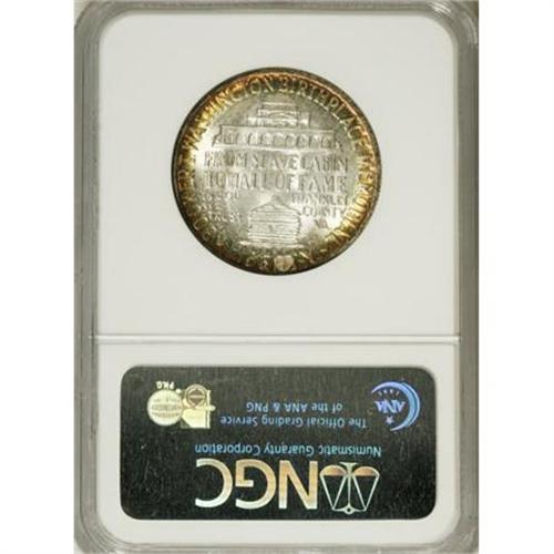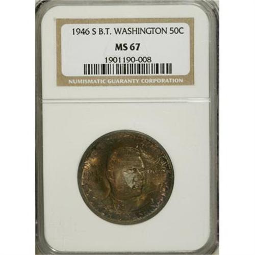 <B>1946-S 50C Booker T. Washington MS67 NGC.</B></I> The rich russet, peach, and olive-gold patina that consumes the obverse appears only at the margins of the reverse. Pleasingly detailed with remarkable eye appeal. NGC has graded just five finer examples (3/08).<BR><BR><b>Shipping:</b> Coins & Currency (<a target="_blank" href="http://www.heritageauctions.com/common/shipping.php">view shipping information</a>)