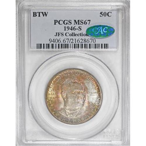 <B>1946-S 50C Booker T. Washington MS67 PCGS. CAC.</B></I> Ex: JFS Collection. Spectacular rose-violet, lime-green, orange, and silver-gray colors embrace this lustrous Superb Gem. An impressively preserved example that has an above average strike on Washington's portrait. Although the 1946-S has a mintage above 500,000 pieces, most scholars believe that many examples were spent or melted. PCGS has graded no coins finer (11/07).<BR><BR><b>Shipping:</b> Coins & Currency (<a target="_blank" href="http://www.heritageauctions.com/common/shipping.php">view shipping information</a>)