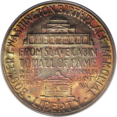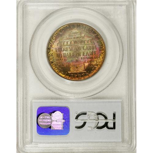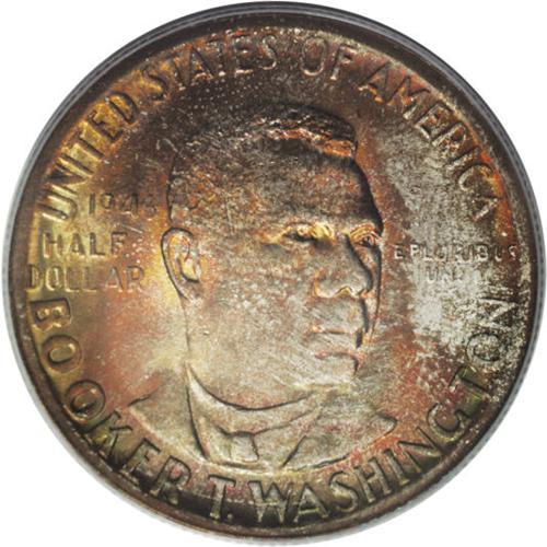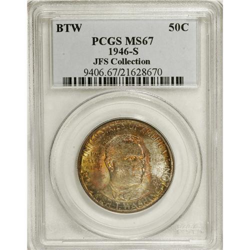 <B>1946-S 50C Booker T. Washington MS67 PCGS.</B></I> Ex: JFS Collection. Spectacular rose-violet, lime-green, orange, and silver-gray colors embrace this lustrous Superb Gem. An impressively preserved example that has an above average strike on Washington's portrait. Although the 1946-S has a mintage above 500,000 pieces, most scholars believe that many examples were spent or melted. PCGS has graded no coins finer (3/07).<BR><I>From The Cary & Cheryl Porter Collection.</B></I><BR><BR><b>Shipping:</b> Coins & Currency (<a target="_blank" href="http://www.heritageauctions.com/common/shipping.php">view shipping information</a>)