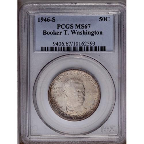 <B>1946-S<50C> Booker T. Washington MS67 PCGS.</B></I> Lovely golden-brown and cream-gray patina enriches this lustrous Superb Gem. Well struck for the type, since the cheek shows little evidence of planchet abrasions. Population: 36 in 67, 0 finer (7/06).