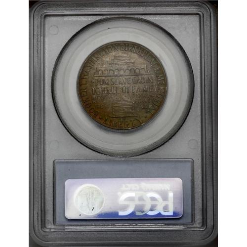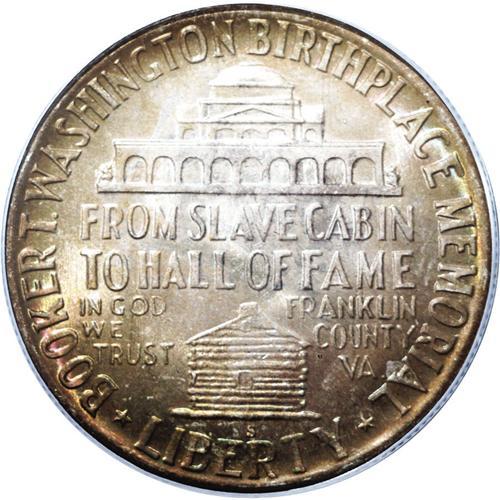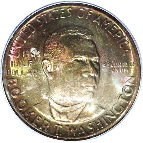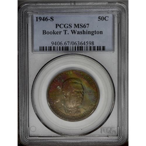 <B>1946-S<50C> Booker T. Washington MS67 PCGS.</B></I> This Superb Gem displays a melange of medium intensity crimson, forest-green, olive-green, and yellow-gold toning on the obverse, while the reverse assumes a more dappled effect of the same color scheme. Bold definition is seen on the design features, and the lustrous surfaces have been well cared for. A minute milling mark in the upper right obverse and a few more on the forehead are concealed within the toning and are mentioned solely for accuracy. Population: 34 in 67, 0 finer (3/06). <BR><BR><B>Important notice:</B> Heritage usually auctions material at the rate of 200-250 lots per hour. On some occasions eBay Live bid software or the Internet may not be able to keep up with the pace of the auction. We recommend placing a realistic absentee bid now as insurance to avoid disappointment. Occasionally the auctioneer may eliminate or reject an eBay Live bid, and the auctioneer may also reopen a lot after the close of the eBay live bidding (usually because we missed an audience bid), and may reject your bid even if it shows you as the winning bidder. By bidding via eBay Live, you agree that Heritage may award the lot to another bidder at its sole discretion under the circumstances described above or any other reasonable circumstances. Since eBay bids are not shown to us until we open the lot on the floor, we treat those bids just like floor bids. In most cases the floor responds before the eBay bid is presented to us, due to Internet lag time, so for consistency we have made it a policy that floor bids are always considered first over tie eBay live bids. Also please note that all Heritage lots purchased through eBay Live carry a 20% Buyer's Premium. Please make sure you read the Terms and Conditions before you bid. This lot is being auctioned in conjunction with a live floor auction by Heritage Galleries & Auctioneers. All final auction and invoice information will be supplied by Heritage Galleries & Auctioneers, and all other information should be considered preliminary. Lot:5116 <BR><BR><B>Winning Notification and Billing:</B> After the FINAL session in this auction is complete, Heritage will send e-mail and snail mail invoices. This process normally takes several days. All final auction and invoice information will be supplied by Heritage Galleries & Auctioneers, and all other information should be considered preliminary. <BR><BR>This auction will be conducted on a live auction floor and over the Internet through eBay Live. If you choose to place an absentee bid, please take a moment to <font color='#0000ff'><u><a href='http://pages.ebay.com/liveauctions/help/before/laabsentee.html'>learn how eBay Live absentee bidding works</a></u></font><font color='#000000'>