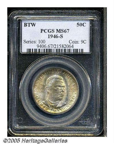 <B>1946-S<50C> Booker T. Washington MS67 PCGS.</B></I> This original looking Superb Gem is awash in variegated copper-gold iridescence that highlights frosty, virtually abrasion-free surfaces. Population: 30 in 67, 0 finer (5/05).