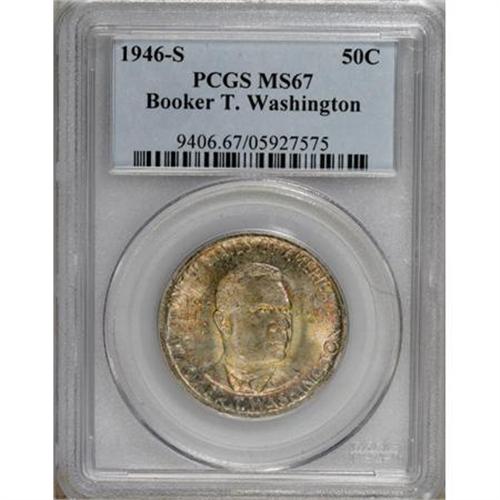 <B>1946-S 50C Booker T. Washington MS67 PCGS.</B></I> Finely speckled multicolored toning covers both sides with strong underlying mint luster. A rare issue in Superb condition.<BR><BR><b>Shipping:</b> Coins & Currency (<a target="_blank" href="http://www.heritageauctions.com/common/shipping.php">view shipping information</a>)