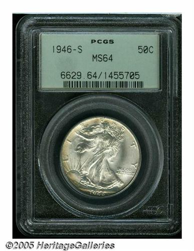 <B>1946-S<50C> MS64 PCGS.</B></I> Boldly struck overall, if slightly weak on Liberty's thumb and head detail, the pleasing mint frost and careful preservation evidenced on both sides of the coin announce it as a conservatively graded near-Gem example.