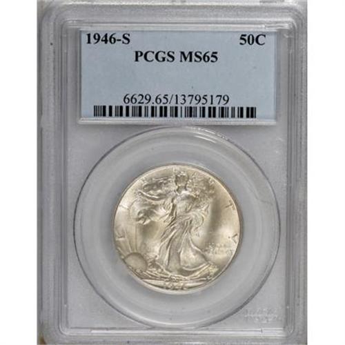 <B>1946-S 50C MS65 PCGS.</B></I> PCGS Population (5026/1226). NGC Census: (3420/1052). Mintage: 3,724,000. Numismedia Wsl. Price for NGC/PCGS coin in MS65: $140. (#6629)<BR><BR><B>Coin Engraver:</B> Adolph A. Weinman<BR><BR><b>Shipping:</b> Coins & Currency (<a target="_blank" href="http://www.heritageauctions.com/common/shipping.php">view shipping information</a>)