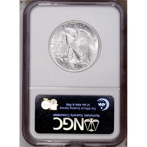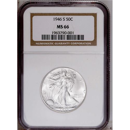 <B>1946-S<50C> MS66 NGC.</B></I> Knob S. A brilliant and impressively preserved Premium Gem with crisp skirt lines and a good strike on Liberty's head. The branch hand is somewhat soft, as usual for S-mint Walkers from the forties.