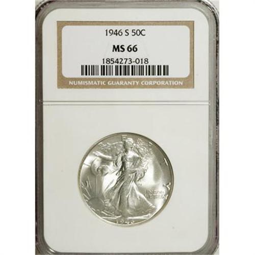 <B>1946-S 50C MS66 NGC.</B></I> NGC Census: (1004/39). PCGS Population (1159/17). Mintage: 3,724,000. Numismedia Wsl. Price for NGC/PCGS coin in MS66: $240. (#6629)<BR><BR><B>Coin Engraver:</B> Adolph A. Weinman<BR><BR><b>Shipping:</b> Coins & Currency (<a target="_blank" href="http://www.heritageauctions.com/common/shipping.php">view shipping information</a>)