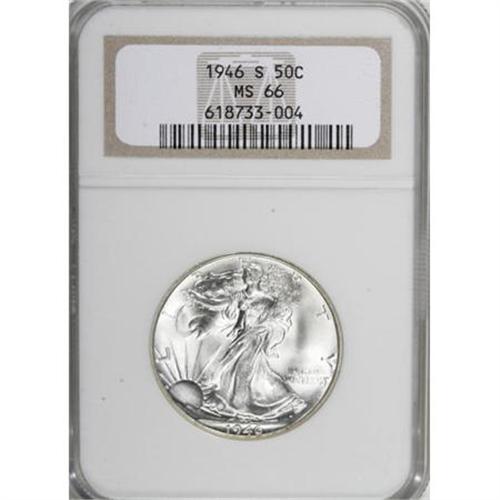 <B>1946-S 50C MS66 NGC.</B></I> NGC Census: (1013/39). PCGS Population (1211/17). Mintage: 3,724,000. Numismedia Wsl. Price for NGC/PCGS coin in MS66: $220. (#6629)<BR><BR><B>Coin Engraver:</B> Adolph A. Weinman<BR><BR><b>Shipping:</b> Coins & Currency (<a target="_blank" href="http://www.heritageauctions.com/common/shipping.php">view shipping information</a>)