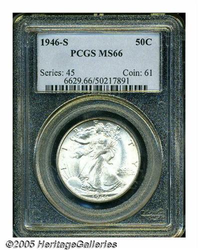 <B>1946-S<50C> MS66 PCGS.</B></I> A highly lustrous premium Gem, the strike is above average for the issue and the surfaces are splendidly undisturbed. Liberty's left thumb displays partial definition, and the gown lines are well incised. The obverse is virtually untoned, while the reverse exhibits just a touch of light tan in limited areas. PCGS and NGC combined have seen only 46 pieces finer (5/05).