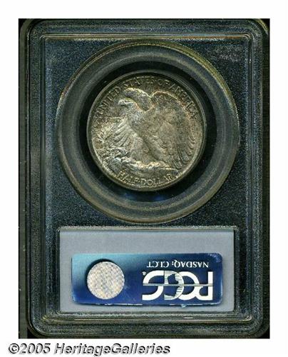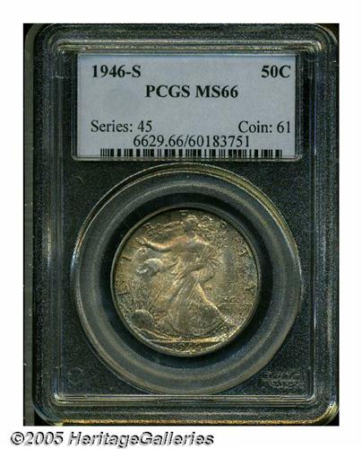 <B>1946-S<50C> MS66 PCGS.</B></I> Dappled gold-beige, sky-blue, and lavender color dots lustrous surfaces, and the design elements are well struck. There are no significant contact marks to report. PCGS has certified only 13 pieces finer (6/05).