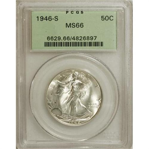 <B>1946-S 50C MS66 PCGS.</B></I> PCGS Population (1178/17). NGC Census: (1008/39). Mintage: 3,724,000. Numismedia Wsl. Price for NGC/PCGS coin in MS66: $240. (#6629)<BR><BR><B>Coin Engraver:</B> Adolph A. Weinman<BR><BR><b>Shipping:</b> Coins & Currency (<a target="_blank" href="http://www.heritageauctions.com/common/shipping.php">view shipping information</a>\)