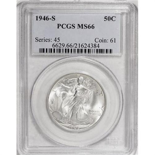 <B>1946-S 50C MS66 PCGS.</B></I> PCGS Population (1242/18). NGC Census: (1025/44). Mintage: 3,724,000. Numismedia Wsl. Price for NGC/PCGS coin in MS66: $220. (#6629)<BR><BR><B>Coin Engraver:</B> Adolph A. Weinman<BR><BR><b>Shipping:</b> Coins & Currency (<a target="_blank" href="http://www.heritageauctions.com/common/shipping.php">view shipping information</a>)