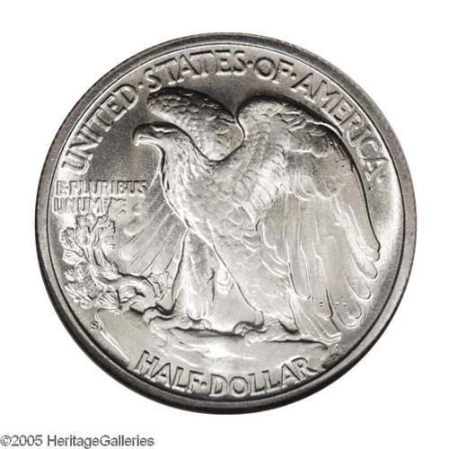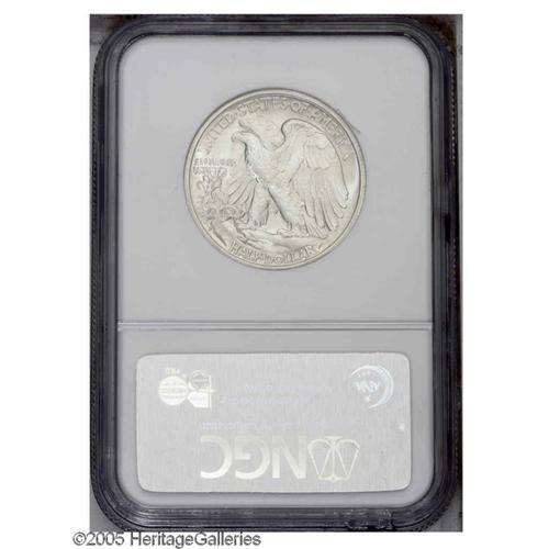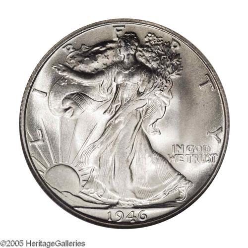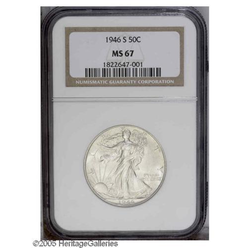 <B>1946-S<50C> MS67 NGC.</B></I> Frosty luster emboldens both sides, which display hints of wispy tan color. The design features are adequately struck, and the surfaces are virtually pristine. This is an important rarity in MS67 grades, with none certified any finer. The final S-mint Walking Liberty half dollar produced in the San Francisco Mint.
