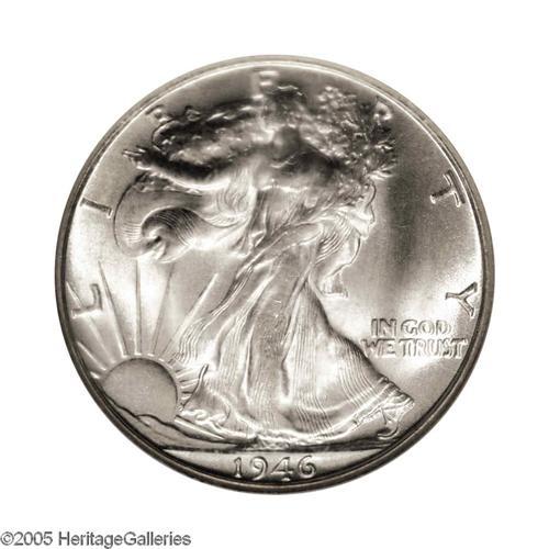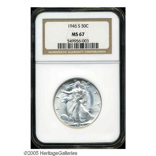 <B>1946-S<50C> MS67 NGC.</B></I> Knob S. The bright-white surfaces are smooth and mark-free, and both sides are at the threshold of an even higher grade. Needless to say, well struck, carefully preserved representatives of this S-mint issue are anything but common in today's market. Census: 32 in 67, none are finer at either service (11/05).