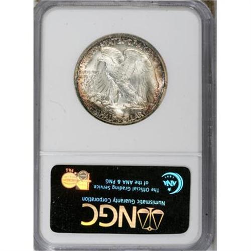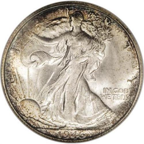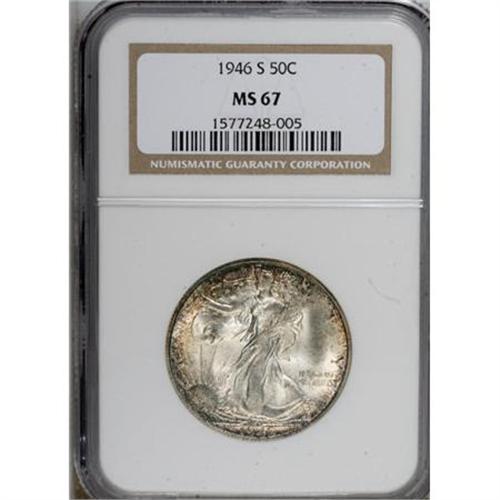 <B>1946-S 50C MS67 NGC.</B></I> Speckles of deep blue, lavender, and golden-brown toning concentrate at the borders of this Superb Gem, and bright luster issues from each side. This piece displays an above-average strike for the date, that is reflected in the sharpness of the gown lines and partial definition in Liberty's left hand and adjacent branches. A minor mark or two on both faces does not detract. Census: 39 in 67, 0 finer (9/07).<BR><BR><B>Coin Engraver:</B> Adolph A. Weinman<BR><BR><b>Shipping:</b> Coins & Currency (<a target="_blank" href="http://www.heritageauctions.com/common/shipping.php">view shipping information</a>)