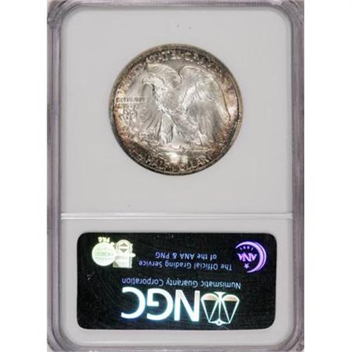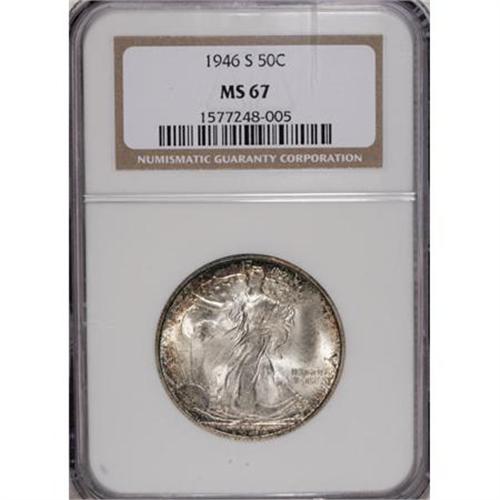 <B>1946-S 50C MS67 NGC.</B></I> The trumpet tail mintmark is widely repunched northwest. Speckles of deep blue, lavender, and golden-brown toning concentrate at the borders of this lustrous Superb Gem. Well struck for a forties S-mint Walker, particularly on the skirt lines. Census: 45 in 67, 0 finer (2/08).<BR><BR><B>Coin Engraver:</B> Adolph A. Weinman<BR><BR><b>Shipping:</b> Coins & Currency (<a target="_blank" href="http://www.heritageauctions.com/common/shipping.php">view shipping information</a>)