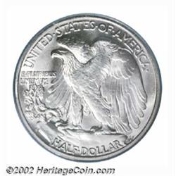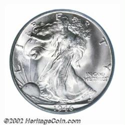 1946-S 50C MS67 PCGS. Here is a coin that will almost certainly sell to a Registry Set collector. It is one of just nine 1946-S Walkers certified MS67 by PCGS, and it is unsurpassed in grade at that service (9/02). This coin displays one of the strongest strikes that we have seen on a '46-S Half. The bright, untoned surfaces shimmer with frosty mint luster, and there are no disturbing bagmarks. Some horizontal striations (as produced) are seen in the obverse field after Liberty's portrait. The final S-mint Walking Liberty Half produced in the San Francisco Mint. Important notice: We expect to be auctioning lots at the rate of 200-250 per hour. Sometimes eBay Premier live bid software cannot keep up with that pace, so we strongly recommend that you place a realistic proxy bid now as insurance to avoid disappointment. Also please note that all Heritage/CAA lots purchased through eBay Premier carry a 20% Buyer's Premium. Please make sure you read the Terms and Conditions.
