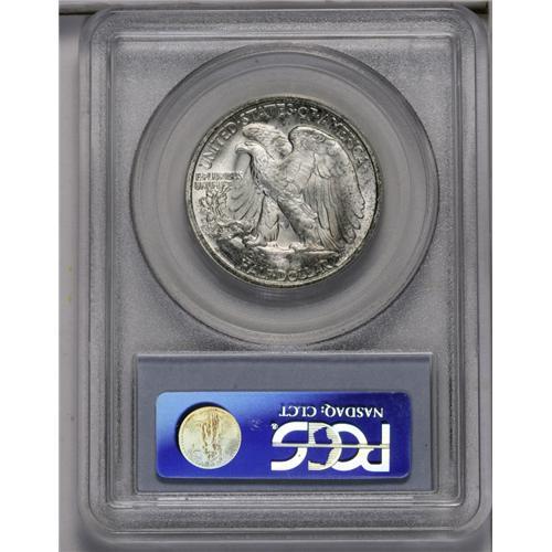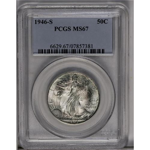 <B>1946-S<50C> MS67 PCGS.</B></I> Trumpet Tail S. Aqua-blue and tan freckles enrich this lustrous and unmarked Superb Gem. The strike is decidedly above average for an S-mint Walker from the forties, although the cheek and branch hand lack absolute detail. Population: 14 in 67, 0 finer (5/06).