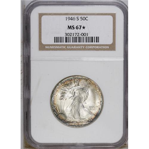 <B>1946-S 50C MS67 <img border='0' src='http://www.heritagecoins.com/images/star.gif' width=10 height=10> NGC.</B></I> A highly lustrous and well struck Superb Gem that earns its star with spectacular peripheral toning in blue-violet and orange-gold. As one of three Star pieces in this grade with none finer, this piece is a strong contender for a high-grade set (10/06).<BR><BR><b>Shipping:</b> Coin/Currency (<a target="_blank" href="http://www.heritageauctions.com/common/shipping.php">view shipping information</a>)