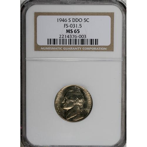<B>1946-S 5C --Doubled Die Obverse--MS65 NGC.</B></I> FS-031.5. DDO FS-031.5. Trumpet tail S. LIBERTY and the date are boldly doubled to the right and the surfaces have retained a slight golden hue. Interestingly, a raised curving line exists in Jefferson's ponytail and should be an easy way to identify this variety. In our September 2005 Long Beach Signature, lot 1954, an example of FS-031.5 certified as MS65 by PCGS realized $2,875. Census: 4 in 65, 1 finer (11/06).<BR><BR><b>Shipping:</b> Coin/Currency (<a target="_blank" href="http://www.heritageauctions.com/common/shipping.php">view shipping information</a>)