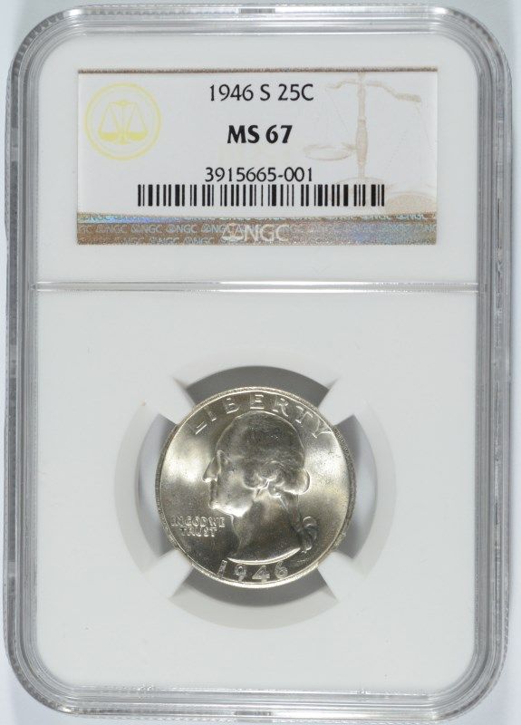 1946-S WASHINGTON QUARTER, NGC MS-67 BLAST WHITE AND RARE!!