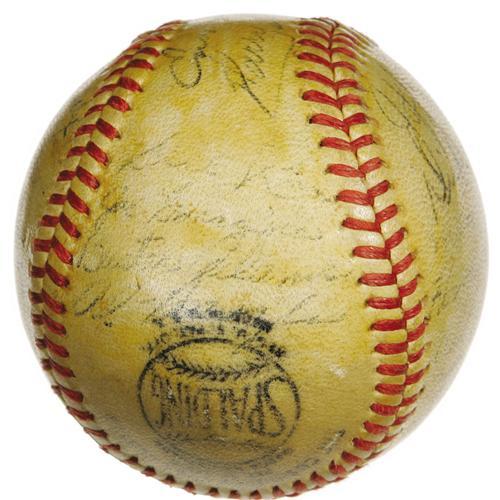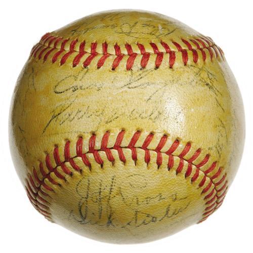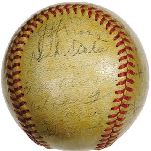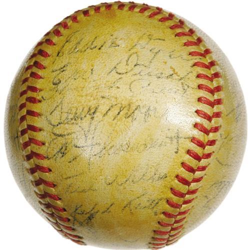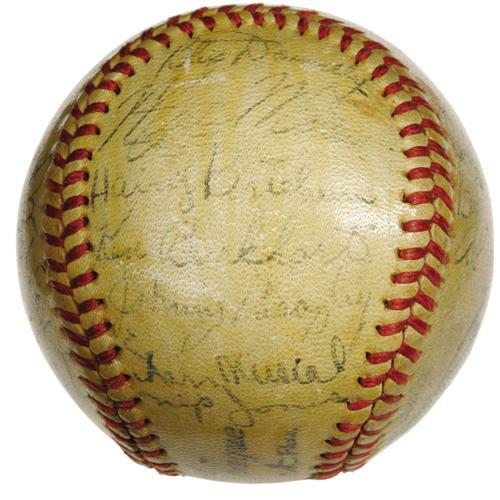 <B>1946 St. Louis Cardinals Team Signed Baseball.</B></I> Country" Enos Slaughter's Mad Dash in Game Seven of the World Series this season was the physical manifestation of the Bambino's Curse, extending the Red Sox' Championship drought for another year. The Hall of Fame speedster appears here on this ONL (Frick) ball with twenty-five of his World Championship teammates, notably Series pitching hero Brecheen, Musial, Schoendienst, Marion, Garagiola, Kurowski and Harry "The Hat" Walker. Jones has been deemed secretarial. Signature quality averages 4/10, and a coating of shellac has resulted in an amber tone. <I>LOA from PSA/DNA. LOA from James Spence Authentication.</B></I><BR><BR><b>Shipping:</b> Balls, etc. (<a target="_blank" href="http://www.heritageauctions.com/common/shipping.php">view shipping information</a>)