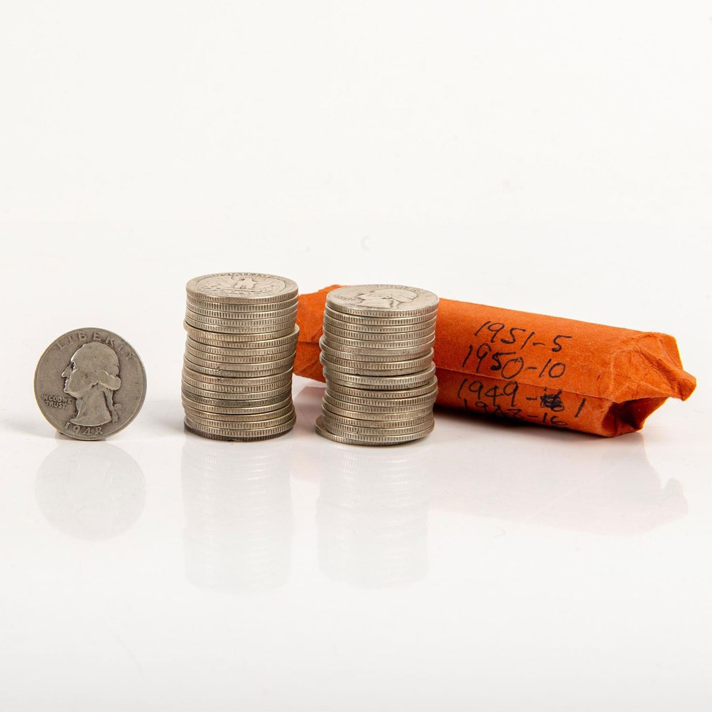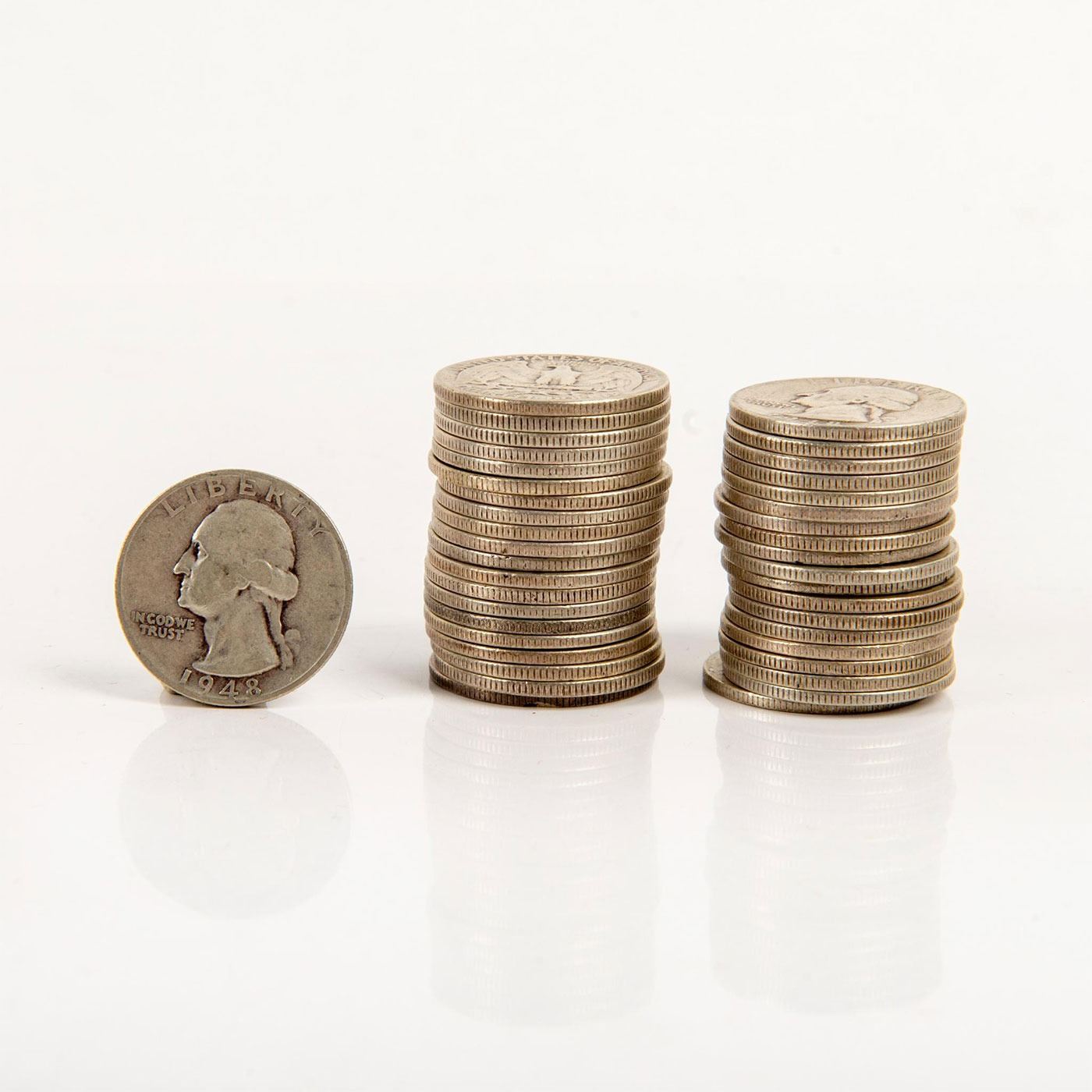 40 Silver quarters dated 1946-1951 in wrapper. This auction is filled with some very sought after coins from a large California coin collection that was first started in the 1940's by a young man who collected until his death in the early 2000's and now is being unearthed for sale. This lot consists of 40 silver quarters. There are 1-1946, 7-1947, 16-1948, 1-1949, 10-1950 and 5-1951 Washington quarters and are in good condition and come with an origonal wrapper. This collection is very cool and has some wonderful examples for the beggining to the advanced collector or for anyone who loves silver or coins. Coins and Currency, Numismatists