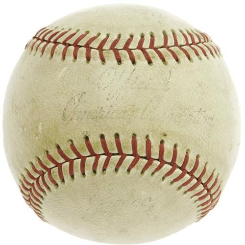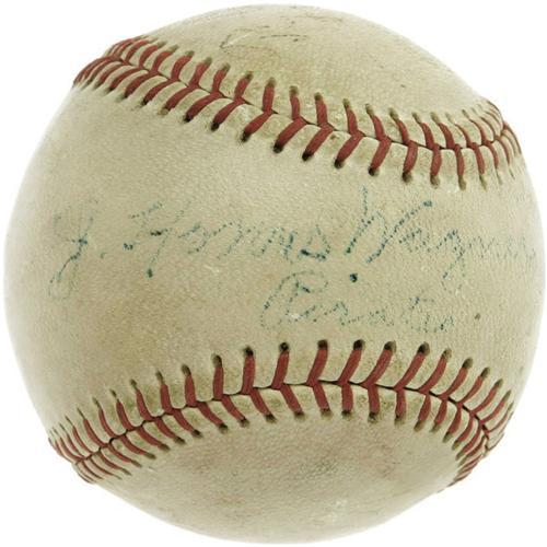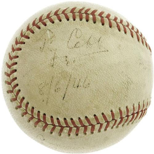 <B>1946 Ty Cobb & Honus Wagner Signed Baseball with Incredible Provenance!</B></I> Almost a century has passed since that early October day in 1909 when the two greatest figures of the Dead Ball era finally met on the field of battle, as the Pirates and Tigers found themselves competing for the Championship in the sixth edition of the World Series. And since that day we have seen many great pairings of teammates and rivals--Ruth and Gehrig, DiMaggio and Williams, Mantle and Maris--but Cobb and Wagner was the first, and rarely did a discussion of the brilliance of one fail to elicit some opinion of the other. Forever linked by their respective dominance of the early game, we nonetheless almost never find them sharing space on a signed baseball such as the one we proudly present here.<BR><BR> The baseball comes to us from a gentleman who had the great fortune of meeting the Georgia Peach in person just after the close of the second World War. Having won an essay contest for which the prize was tickets to a Comiskey Park playing of the "All American Boys Baseball Game," twelve-year old Dennis Varvel was thrilled to find that the managers of the East and West teams were Wagner and Cobb respectively. As included newspaper clippings note, one of the event promoters "corralled Cobb and in a few minutes we had a picture of the 'Georgia Peach' gifting Dennis with an autographed baseball, signed by both East and West team managers. Wide-eyed Dennis gapped at the signatures of both Ty Cobb and Honus Wagner and decided right then and there that would be one baseball he'd keep for the rest of his life."<BR><BR> Thankfully for our Heritage collecting family, this final statement did not prove to be entirely accurate, though Mr. Varvel did cherish the baseball for close to six decades before consigning it to our October Signature auction. And so this baseball, which is being passed from Cobb's right hand to Dennis' in the included 8x10" photo (printed in the newspaper clipping as well), is offered here for the first time to the collecting community. On the sweet spot of this "Official American Association" baseball is the blue ink inscription, "J. Honus Wagner, Pirates," while the side panel just above reads, "Ty Cobb, 8/6/46." Each presents as an impressive 6-7/10 in strength. Barely visible to the right of Wagner is the childlike autograph of Dennis Varvel, further verifying the iron-clad provenance of the piece. The ball itself is modestly and evenly toned and shows an absolute minimum of wear, clearly having been cherished from the moment it left Ty Cobb's hand and was placed in that of a wide-eyed kid from Chicago. <I>LOA from James Spence Authentication. LOA from PSA/DNA.</B></I><BR><BR><b>Shipping:</b> Balls, etc. (<a target="_blank" href="http://www.heritageauctions.com/common/shipping.php">view shipping information</a>)