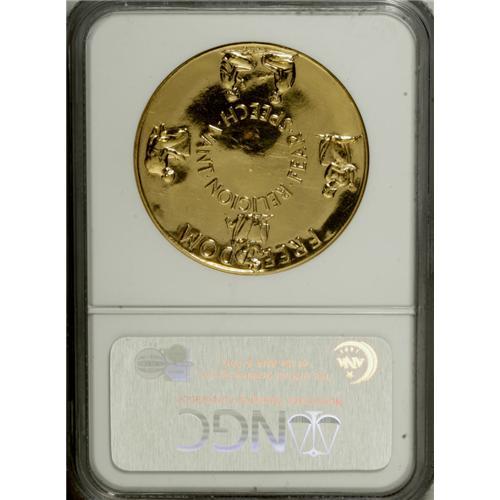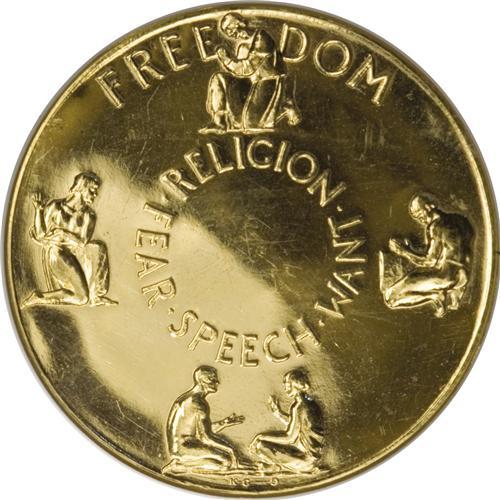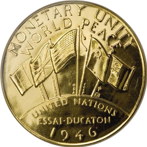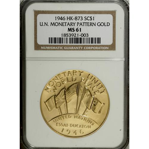 <B>1946 U.N. Monetary Gold Pattern MS61 NGC.</B></I> HK-873. Struck in .900 fine gold. Numismatists Abe Kosoff and Hans Schulman worked with medalist Karl Gruppe for this 1946 issue, struck by the Medallic Art Co. Kosoff and Schulman intended a global U.N. currency to further world harmony, but the Treasury Department opposed the plan. A glossy and attractive example, cleaner than the MS61 grade suggests. NGC has certified just two gold examples, as of (12/06).<BR><BR><b>Shipping:</b> Coins & Currency (<a target="_blank" href="http://www.heritageauctions.com/common/shipping.php">view shipping information</a>)